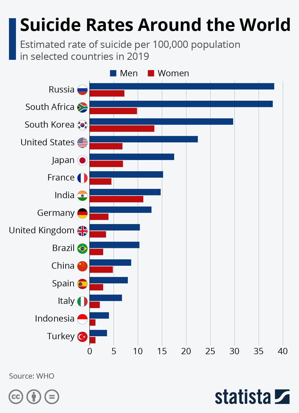 Men are far less likely to seek mental health treatment. Men are far likely to engage in violent behaviours. And men are far more likely to commit suicide.